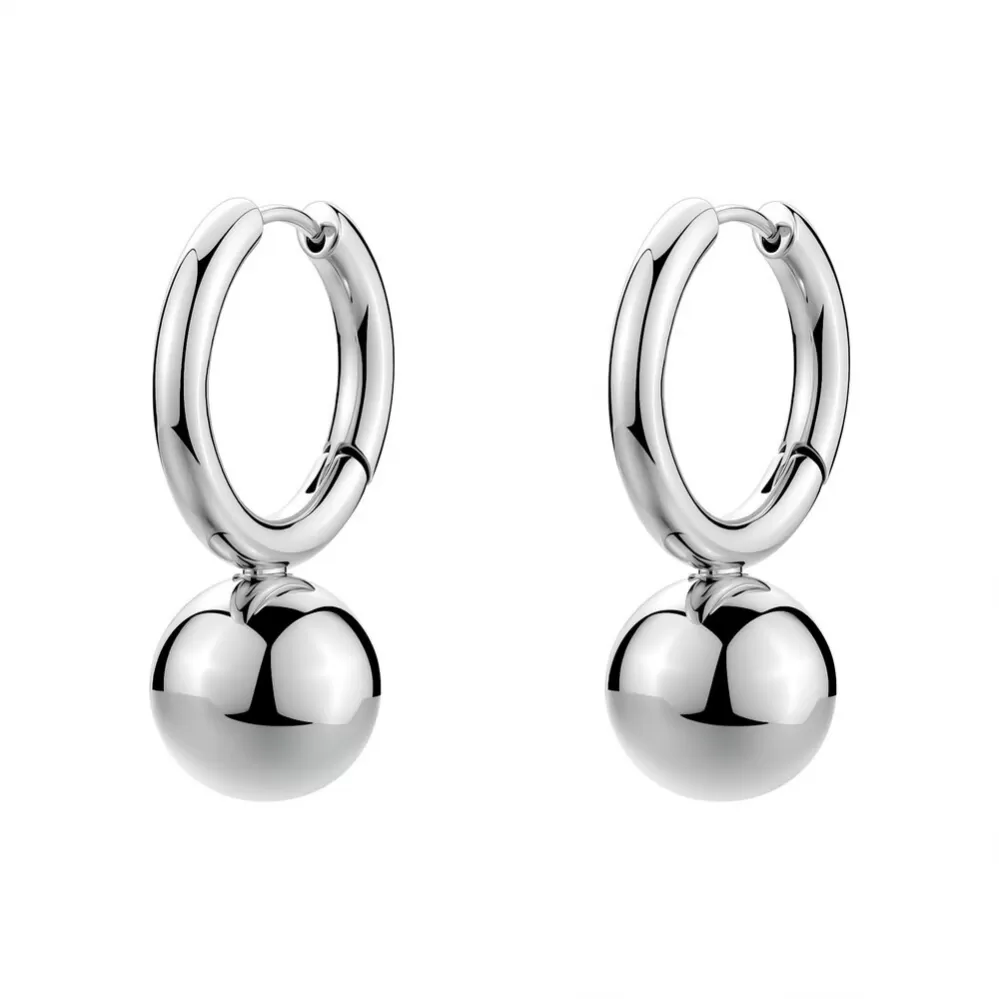 Tyto náušnice jsou vyroben z chirurgické oceli, která zaručuje odolnost, pevnost a dlouhou životnost. Jedná se o kruhové náušnice s přívěskem ve tvaru lesklé kuličky, což dodává jemnost i zajímavý vizuální detail. Průměr náušnic činí 28 mm. Zapínání je řešeno pomocí ocelového patentu, což umožňuje pohodlné bezpečné nasazení. Náušnice působí lehce a vzdušně, vhodné pro každodenní nošení ke všem typům outfitu.