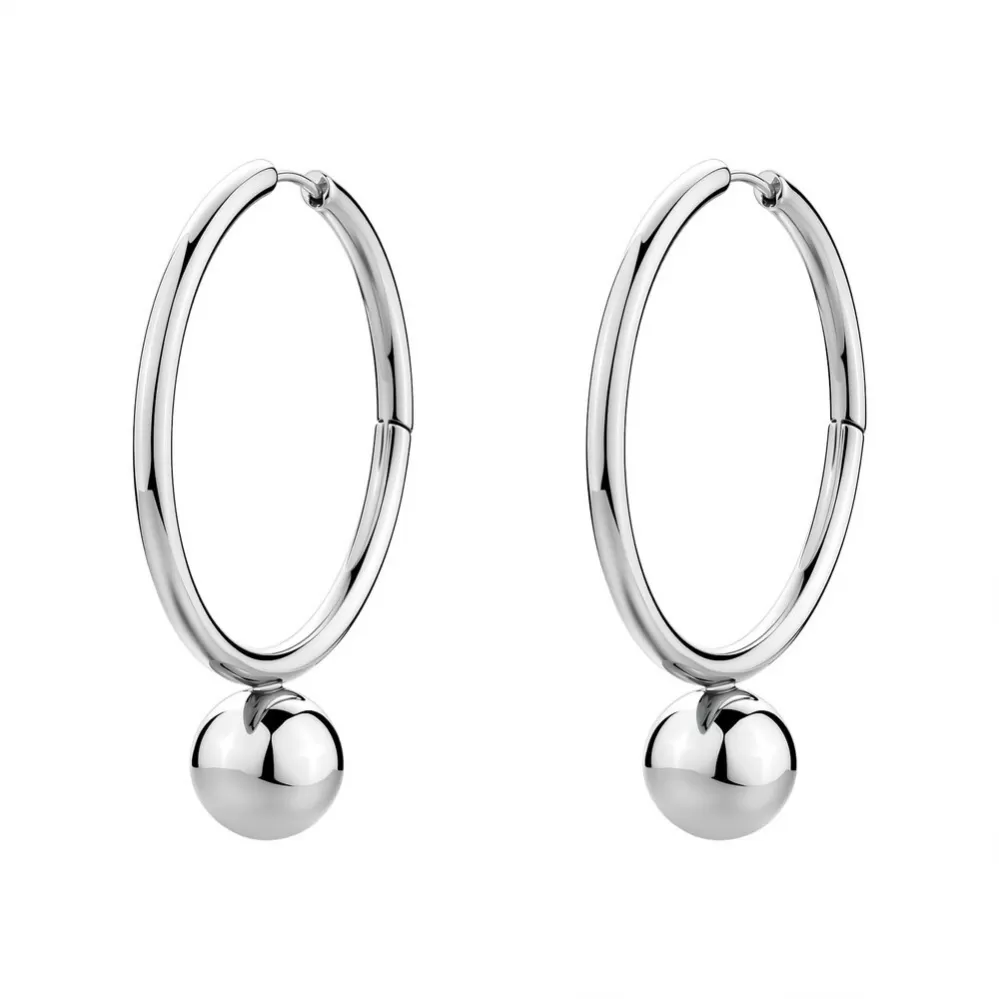 Tyto náušnice jsou vyroben z chirurgické oceli, která zaručuje odolnost, pevnost a dlouhou životnost. Design zahrnuje větší kruhy doplněné ozdobným přívěskem kuličky, což dodává náušnicím jemnost a dynamiku pohybu. Mají průměr 46 mm a využívají ocelový patent jako zapínání. V celkovém dojmu působí tyto náušnice lehce a vkusně, hodí se každodennímu nošení, ale díky svému vzhledu i k večernímu outfitu.