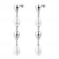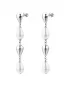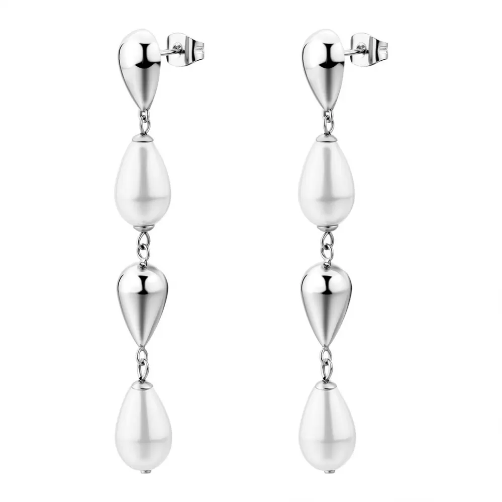 Elegantní náušnice kombinují jemnost, ženskost a moderní design. Vyrobeny jsou z chirurgické oceli, která je vysoce odolná, pevná a hypoalergenní, takže jsou vhodné i pro citlivé uši. Design náušnic tvoří delší visací tvar o délce 58 mm, který působí elegantně a opticky prodlužuje krk. Náušnice jsou ozdobeny ocelovými kapkami a dekorativními prvky s imitací perel, které vytvářejí decentní kontrast mezi kovovým leskem a bílou barvou perel.