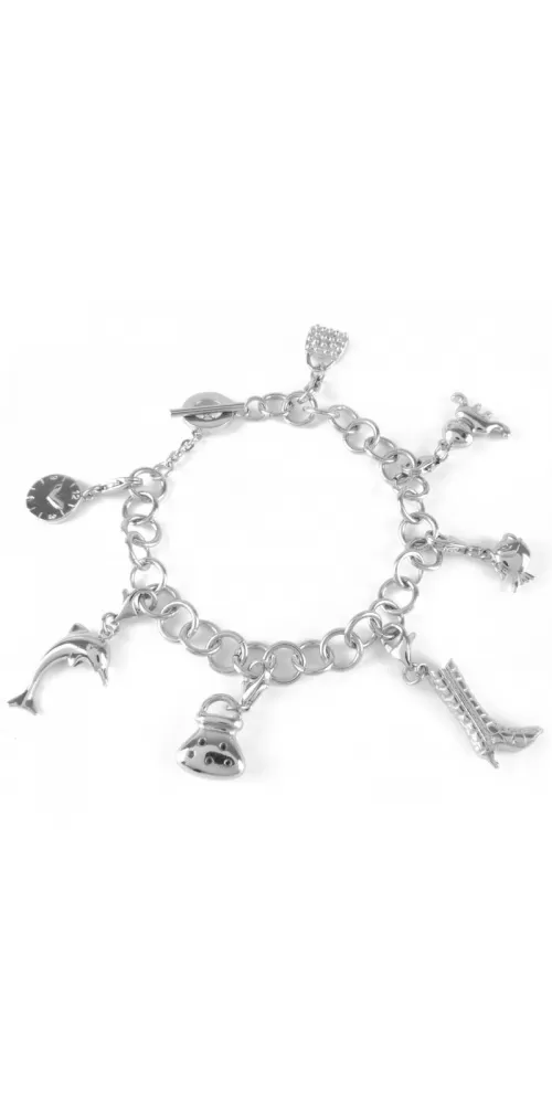 Velice pěkný moderní plastický přívěsek na náramek z chirurgické oceli ve tvaru kabelky v lesklé povrchové úpravě.