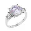 Krásný prsten vyrobený z chirurgické oceli v lesklé povrchové úpravě s jedním větším kulatým zirkonem a čtyřmi menšími obdelníčky vsazených do krapen, které umožňují maximální vyniknutí velikosti kamenů a jejich brilanci.