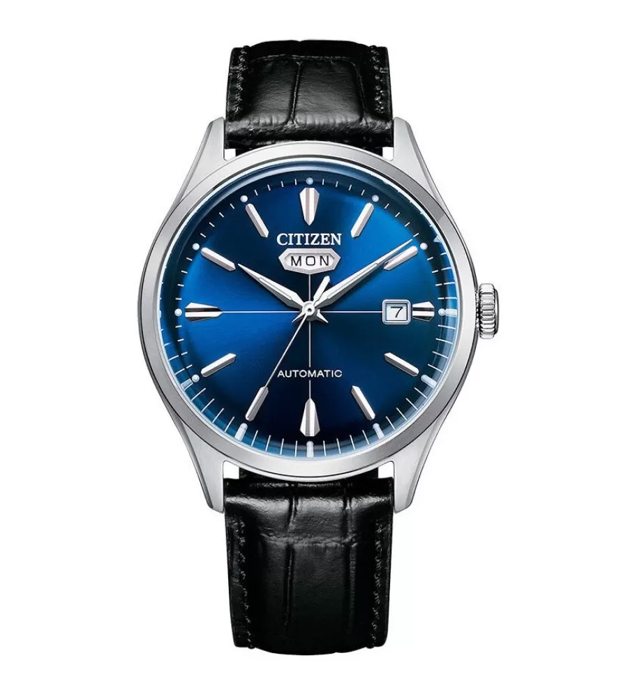 Na ciferníku v modrém tónu najdeš analogové ručičky pro hodiny, minuty i sekundy, doplněné o ukazatel dne v týdnu a datum – tohle řešení dává hodinkám praktickou užitnou hodnotu pro běžné nošení. Uvnitř je mechanický automatický strojek Citizen kalibru 8200, který se natahuje pohybem ruky (a lze ho i ručně dotáhnout), a nabízí přibližně 40 hodin rezervy chodu, takže hodinky fungují bez baterie.