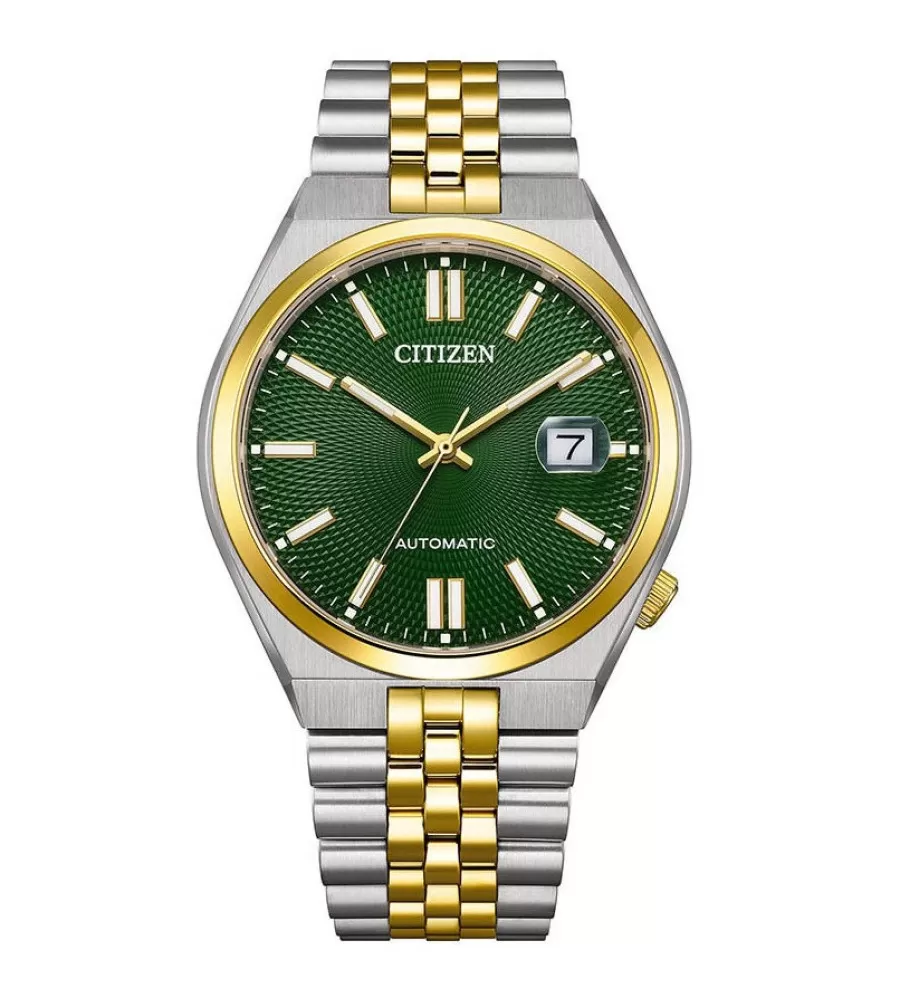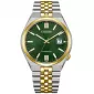 Tyto stylové hodinky jsou vhodné pro muže i ženy. Jsou to automatické hodinky, které kombinují elegantní design s praktickými funkcemi. Jejich dvoubarevné ocelové pouzdro o průměru 40 mm je doplněno pětirohovým náramkem s motýlkovou sponou. Zelený ciferník s jemným vzorem působí velmi výrazně a současně vkusně, doplňují ho zlaté detaily a luminiscenční ručičky, které zajišťují čitelnost i ve tmě. Hodinky pohání mechanický samonatahovací strojek, který nabití rezervu chodu až 60 hodin. Mají datum na pozici 3 hodiny, které je zvětšené lupou. Sklo je safírové, odolné proti poškrábání, což zvyšuje trvanlivost a zachovává čistý vzhled ciferníku.