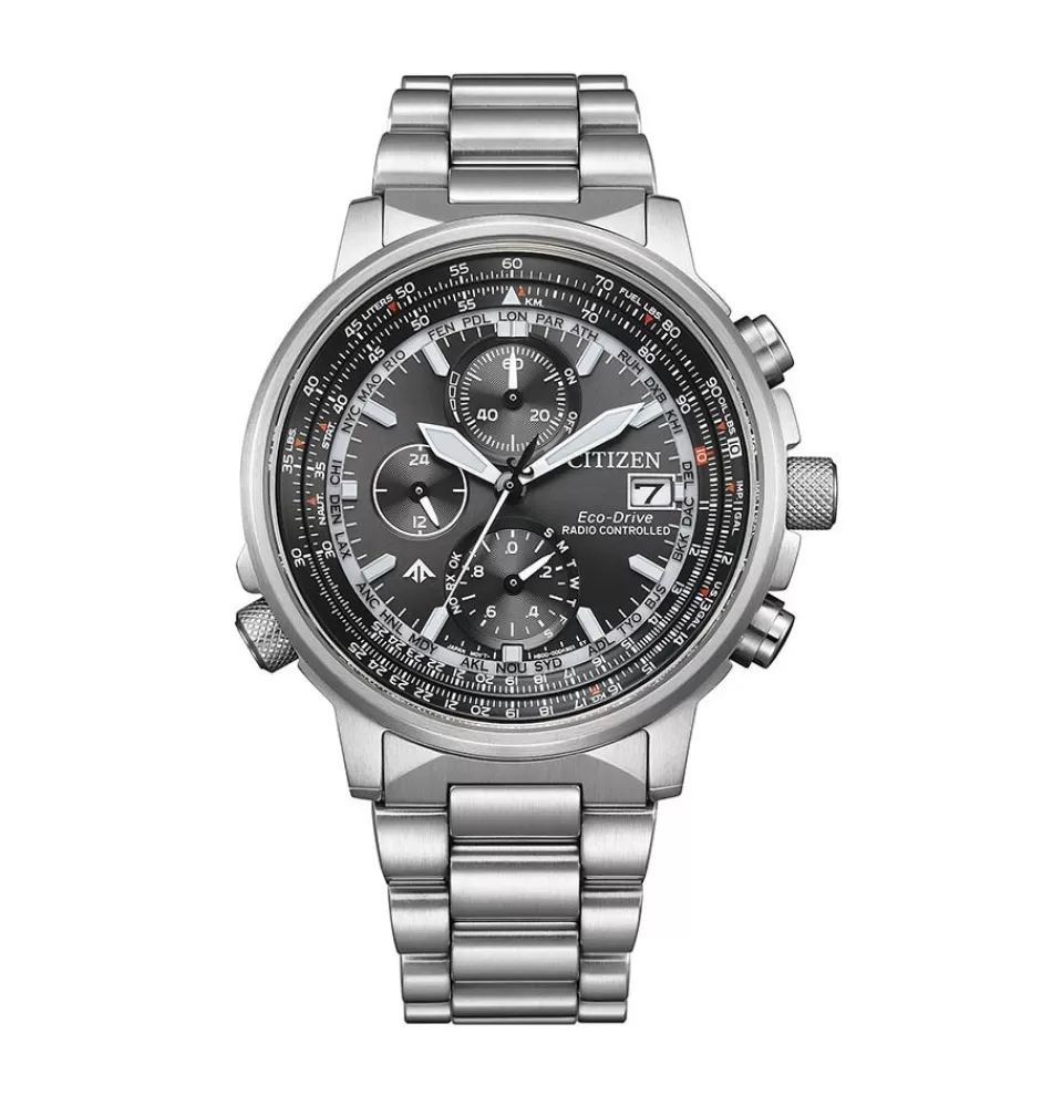 Pánské hodinky Citizen Promaster AT8300-58E patří do profesionální kolekce Promaster Sky inspirované pilotními hodinkami. Model spojuje sportovní design s pokročilými technologiemi značky Citizen a je navržen pro každodenní nošení i náročnější podmínky. O přesný chod se stará solární strojek Eco-Drive kalibr H800, který využívá světlo jako zdroj energie. Díky tomu není potřeba měnit baterii a hodinky mají při plném nabití rezervu chodu přibližně 180 dní. Navíc disponují funkcí radio-controlled, která automaticky synchronizuje čas pomocí signálu z atomových hodin v Evropě, USA, Číně a Japonsku, čímž zajišťuje maximální přesnost.