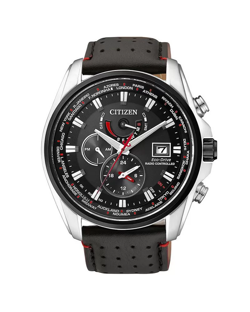 Luxusní pánské hodinky Citizen AT9036-08E mají pouzdro z nerez oceli a kožený řemínek. Ciferník kulatého tvaru v černé barvě nabízí funkce jako např.: datumovka, plně automatický kalendář, světové časy, letní čas, kontrola stavu baterie, 24hodinový ciferník. Příjem rádiového signálu (vysílače): DCF, WWVB, JJY, BPC.