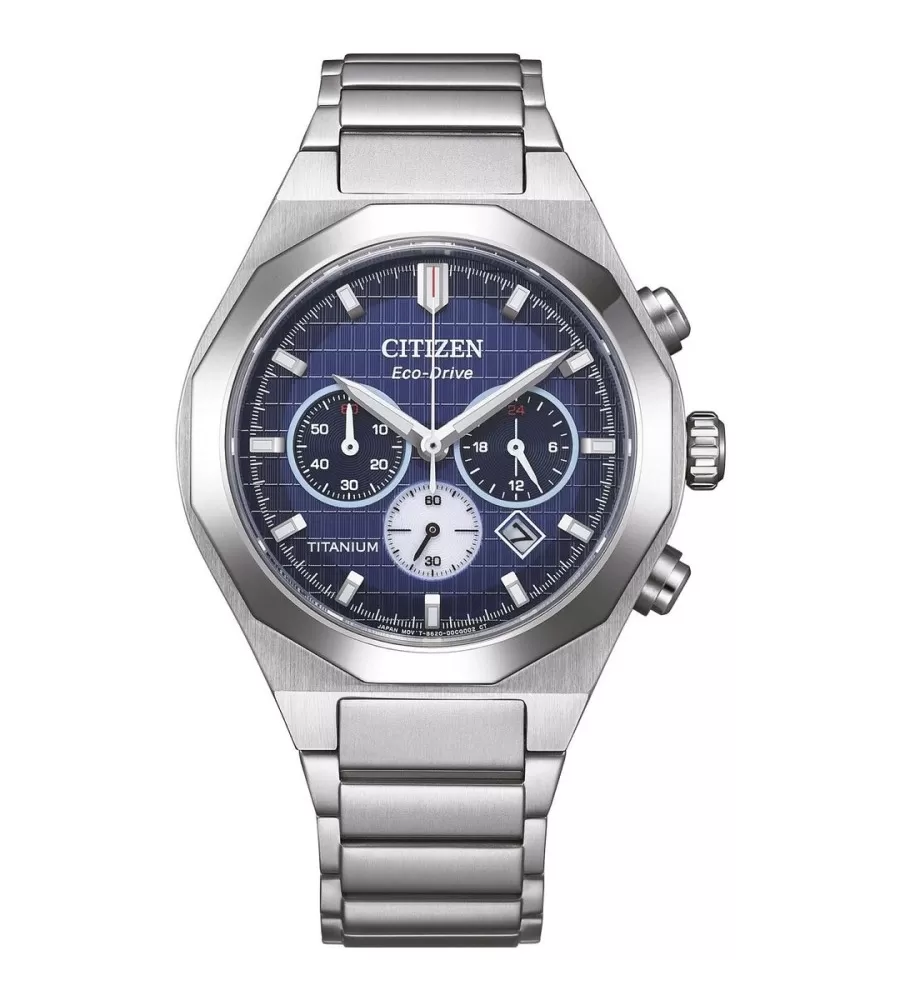 Tyto hodinky přinášejí moderní  sportovní vzhled v kombinaci s lehkým a odolným materiálem Super Titanium, který je hypoalergenní a pětkrát tvrdší než běžná ocel. Pohání je solární pohon Eco-Drive, takže energii čerpají ze světla a po plném nabití vydrží fungovat až devět měsíců. Pouzdro má průměr 41 mm a výšku necelých 12 mm. Safírové sklo chrání modrý ciferník se strukturovaným vzorem, na kterém vynikají tři subciferníky - malá vteřinovka, 24 hodinový ukazatel a chronograf.
