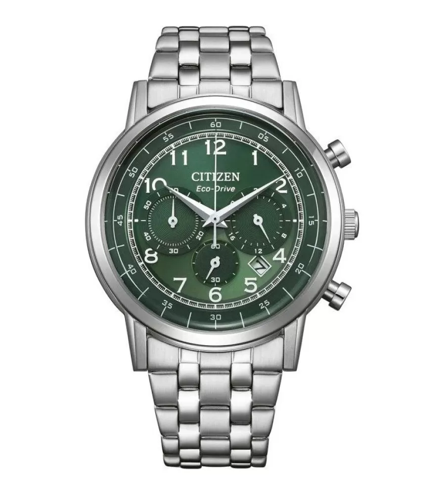 Model Citizen CA4630-53X jsou pánské sportovně-elegantní hodinky, které kombinují klasický vzhled s praktickými funkcemi pro každodenní nošení. Mají pouzdro z nerezové oceli o průměru přibližně 42 mm a ocelový řemínek, který zajišťuje pohodlí i stylový vzhled. Dominantou je bízelený ciferník s výraznými arabskými číslicemi a ručičkami, díky kterým je čas dobře čitelný. Ciferník obsahuje také tři subciferníky pro funkci chronografu (stopky), 24hodinový ukazatel a nechybí ani datumovka.