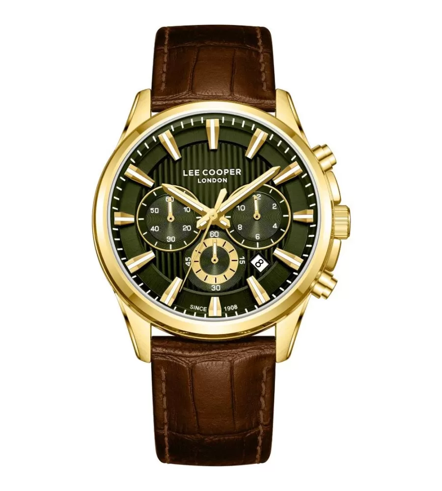 Elegantní model se sportovním nádechem pro muže má kovové pouzdro ve zlaceném provedení a kožený řemínek v příjemné hnědé barvě s kovovou sponou. Tato kombinace je neodolatelná a velmi v kurzu. Ciferník v zelené barvě doplňují zlatavé ručičky a indexy hodin a disponuje datumovkou, která je umístěna na pozici mezi třetí a pátou hodinou. Hodinky jsou vhodné pro každodenní nošení i na společenské akce.