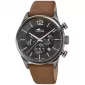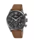 Tento model jsou pánské hodinky z kolekce Chrono, které kombinují sportovní funkce s elegantním vzhledem. Mají kulaté pouzdro z nerezové oceli o průměru přibližně 43 mm a tloušťce kolem 11 mm. Černý ciferník je chráněn minerálním sklem a doplňují jej tři chronografy s funkcí stopek, 24hodinovým subciferníkem a datumovým okénkem. Hodinky jsou poháněny quartzovým strojkem Miyota MJS25 a mají kožený, hnědý řemínek. Vodotěsnost dosahuje 100 ATM, což znamená, že jsou vhodné pro plavání a běžné vodní aktivity.