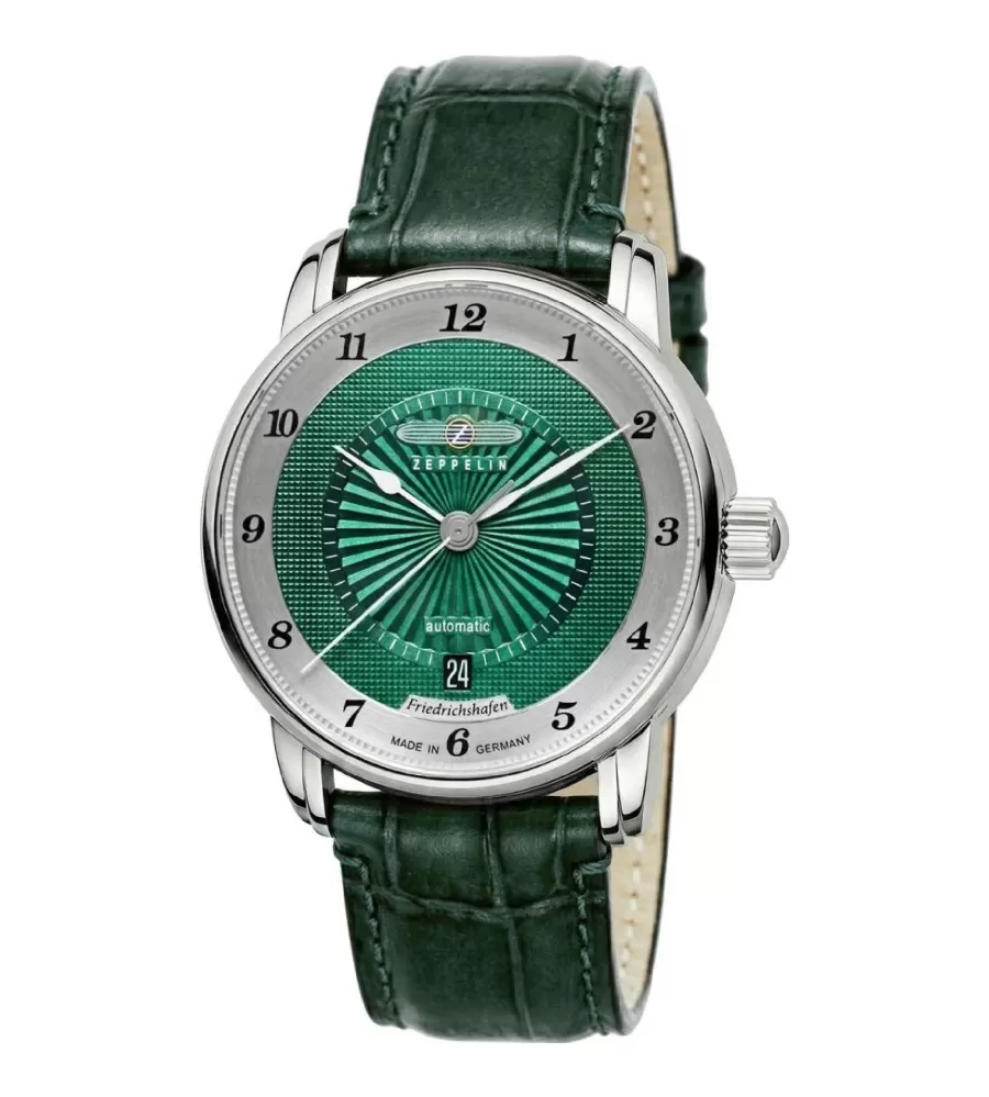Pánské hodinky Zeppelin 8556-2 z kolekce Friedrichshafen spojují klasický design inspirovaný historickými vzducholoděmi Zeppelin s kvalitním mechanickým zpracováním. Elegantní model zaujme výrazným zeleným ciferníkem s jemným guilloché vzorem a arabskými číslicemi, které zajišťují dobrou čitelnost času. Pouzdro z leštěné nerezové oceli o průměru přibližně 40 mm doplňuje stylový kožený řemínek v zeleném odstínu s krokodýlím vzorem, který podtrhuje luxusní charakter hodinek. Ciferník chrání odolné safírové sklíčko a díky luminiscenčním ručičkám je čas dobře čitelný i za zhoršených světelných podmínek.
