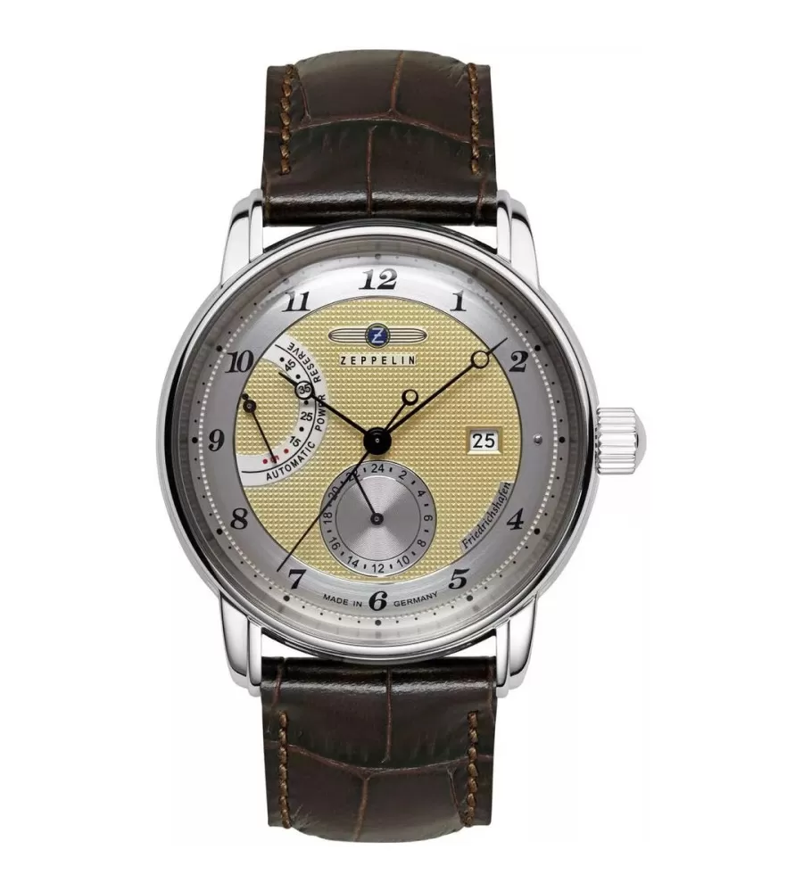 Zeppelin Friedrichshafen Automatic 8590-5 jsou elegantní pánské hodinky inspirované klasickým designem historických vzducholodí Zeppelin. Model z kolekce Friedrichshafen spojuje tradiční hodinářské prvky, kvalitní mechanický strojek a nadčasový vzhled, který se hodí jak k obleku, tak ke každodennímu nošení. Hodinky mají ocelové pouzdro o průměru 42 mm doplněné hnědým koženým řemínkem, který podtrhuje jejich elegantní charakter. Zlatavý ciferník s jemným vzorem Clous de Paris je doplněn arabskými číslicemi a několika praktickými funkcemi – ukazatelem rezervy chodu, 24hodinovým subciferníkem a datem na pozici třetí hodiny.