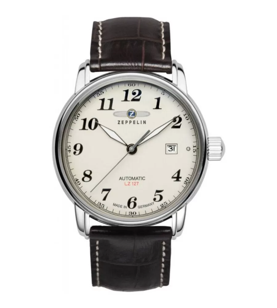 Pánské hodinky Zeppelin LZ 127 Graf Zeppelin 7656-5 představují elegantní model inspirovaný slavnou vzducholodí Graf Zeppelin a klasickým leteckým designem. Nadčasový béžový ciferník s výraznými černými arabskými číslicemi a klasickými ručičkami zajišťuje velmi dobrou čitelnost a dodává hodinkám sofistikovaný, lehce vintage charakter. Pouzdro hodinek je vyrobeno z leštěné nerezové oceli o průměru přibližně 40 mm, což zajišťuje pohodlné nošení na většině zápěstí. Elegantní vzhled doplňuje hnědý kožený řemínek s prošitím, který podtrhuje klasický styl hodinek a hodí se jak ke společenskému oblečení, tak pro každodenní nošení.