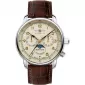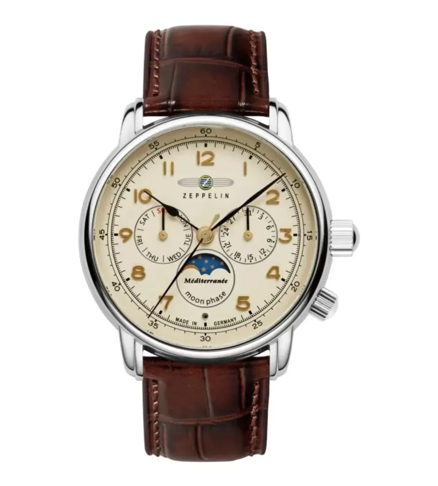 Pánské hodinky Zeppelin Méditerranée Quartz 9636-5 představují elegantní model inspirovaný klasickým stylem a tradicí značky Zeppelin. Nadčasový ciferník v barvě šampaňského doplňují zlaté indexy a subciferníky, které dodávají hodinkám luxusní a zároveň velmi přehledný vzhled. Pouzdro z leštěné nerezové oceli o průměru přibližně 40–42 mm je doplněno hnědým koženým řemínkem, který podtrhuje klasický charakter hodinek a zajišťuje pohodlné nošení. Ciferník chrání odolné minerální sklíčko a vodotěsnost 5 ATM (50 m) umožňuje běžné každodenní používání, například při mytí rukou nebo dešti.
