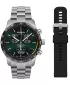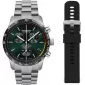 Ciferník modelu je výrazné zelené barvy, doplněný třemi subciferníky chronografu a tachymetrickou stupnicí po jeho obvodu, což dodává hodinkám sportovní charakter a umožňuje měřit krátké časy i rychlosti. Ručičky a indexy jsou opatřeny luminiscencí Super‑LumiNova, takže čas zůstává dobře čitelný i ve tmě nebo za šera.