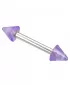 Moderní piercing do obočí je vyrobený z chirurgické oceli v lesklé povrchové úpravě. Piercing je ozdoben žlutými fialovými hroty.