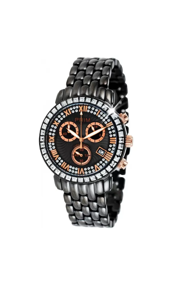 Luxusní model dámských náramkových hodinek značky Prim s chronografem si zamilujete! Hodinky jsou celé vyrobené z oceli s povrchovou úpravou IPG v češrném odstínu. Pouzdro je kulatého tvaru osázené zářivými krystaly Swarovski díky kterým jsou hodinky nepřehlédnutelné. Ciferník je černý s římskými číslicemi.