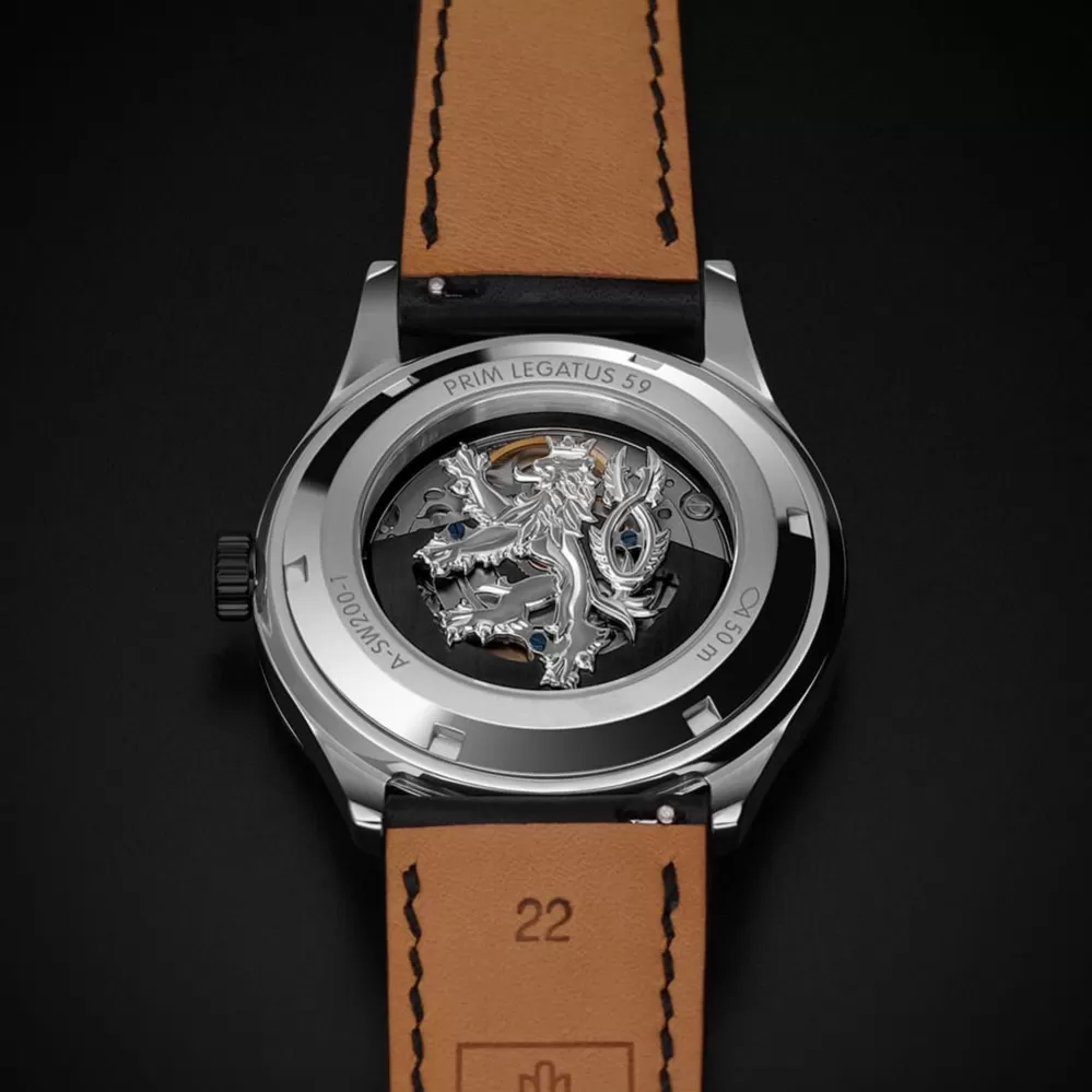 PRIM LEGATUS 59 představuje klasiku v novém pojetí, která se hodí do divadla, na obchodní schůzky i pro každodenní nošení. Díky luminiscenčním prvkům na číselníku a ručkách snadno přečtete čas i za šera a v noci. Safírové konvexní sklo omezuje odlesky a zajišťuje vysokou čitelnost i komfort při pohledu na ciferník. Uvnitř pracuje spolehlivý švýcarský kalibr Sellita SW200-1 s rotorem zdobeným českým lvem, který je viditelný průhledem ve víku. Hodinky jsou voděodolné do 5 ATM a dostupné v několika barevných variantách. Součástí balení je kovový tah i sladěný kožený řemínek, které podtrhují jejich nadčasový společenský styl.