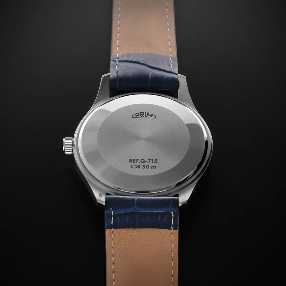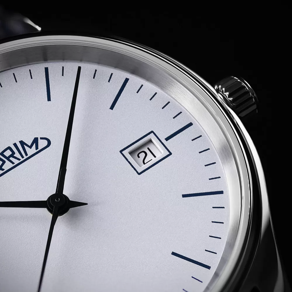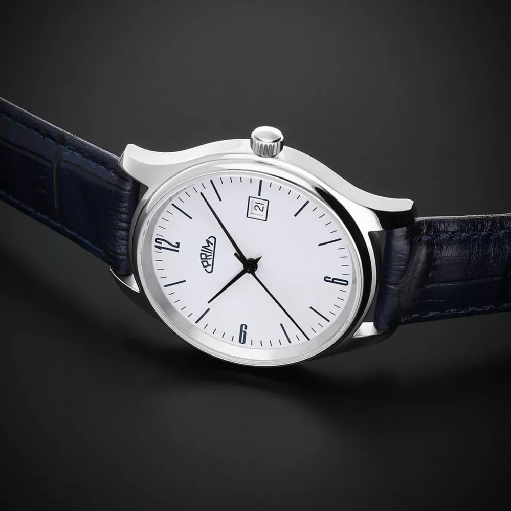 Nový design oblíbeného modelu, který patří k nejprodávanějším. Jemné pouzdro, jednoduché čitelné číslice, datum a tři barevné varianty číselníku. Datum a stylové štíhlé ručky pěkně doplňují celkové vyznění vzhledu. Logo PRIM je umístěno v horní části.  Uvnitř těchto bateriových hodinek pracuje Quartz ETA F06.412. Doplněny jsou kvalitním koženým řemínkem.