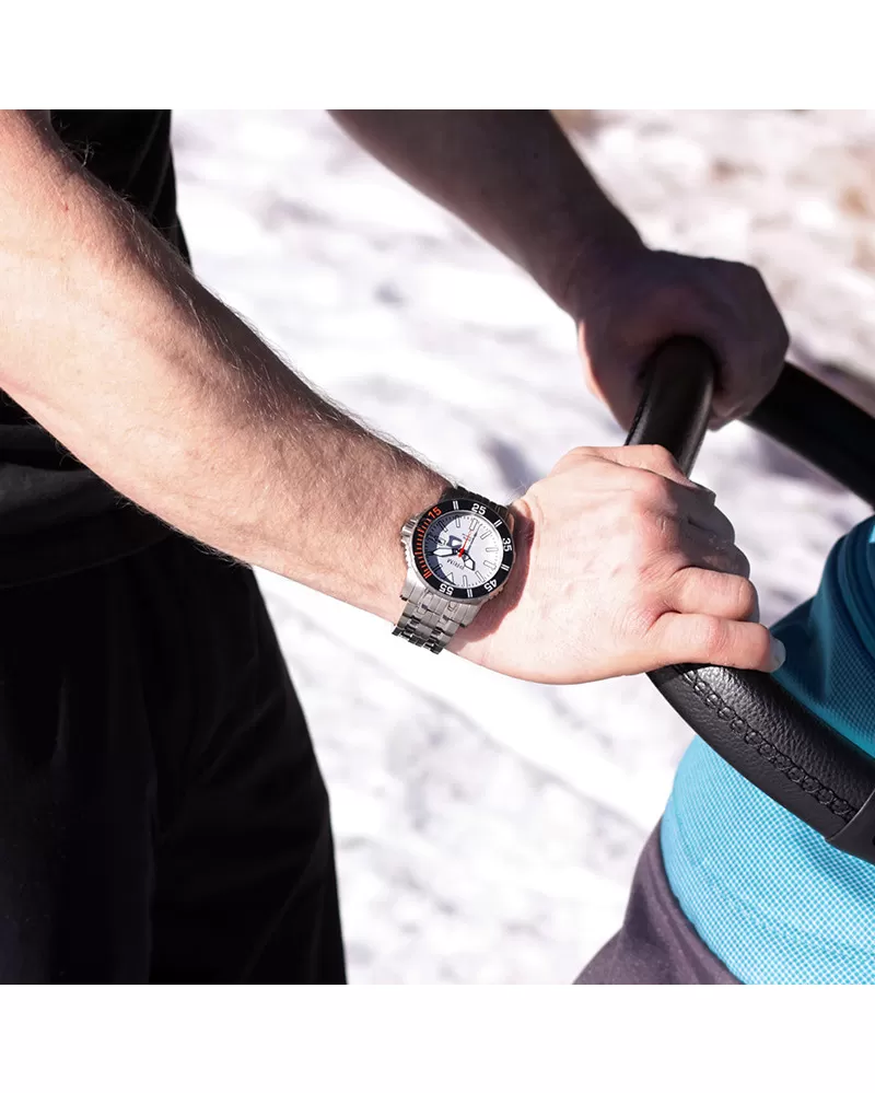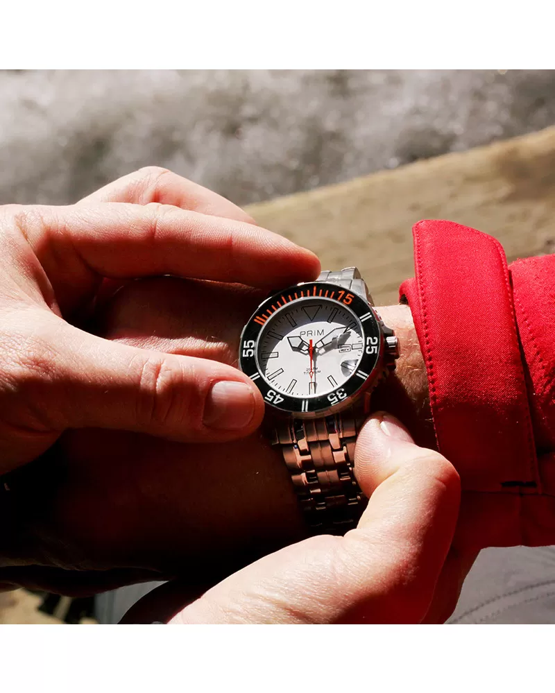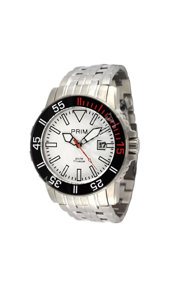 Tento model pánských náramkových hodinek značky Prim je vyrobený z velmi lehkého titanu, který je antialergický. Pouzdro s otočnou lunetou je kulatého tvaru, ciferník je bílý s ručičkami a indexy pokryté luminiscenční vrstvou.