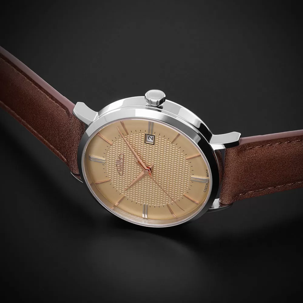 Elegance inspirovaná 60. lety minulého století se u automatických hodinek PRIM Tempo Essence promítá do jemných, čistých a noblesních linií. Nadčasový design v několika barevných provedeních zaujme při každém pohledu na zápěstí a je ideální pro každodenní nošení i výjimečné okamžiky. Minimalistický číselník s jemnými indexy a datem v barvě číselníku vzdává hold českému hodinářskému světu. O spolehlivý chod se stará japonský automatický strojek Miyota 8315 s funkcí data. Klenutý číselník, dvojité klenuté safírové sklíčko a japonská luminiscence zajišťují eleganci i perfektní čitelnost za každých podmínek. PRIM Tempo Essence je stylový šperk, který harmonicky spojuje noblesu, praktičnost a spolehlivost.