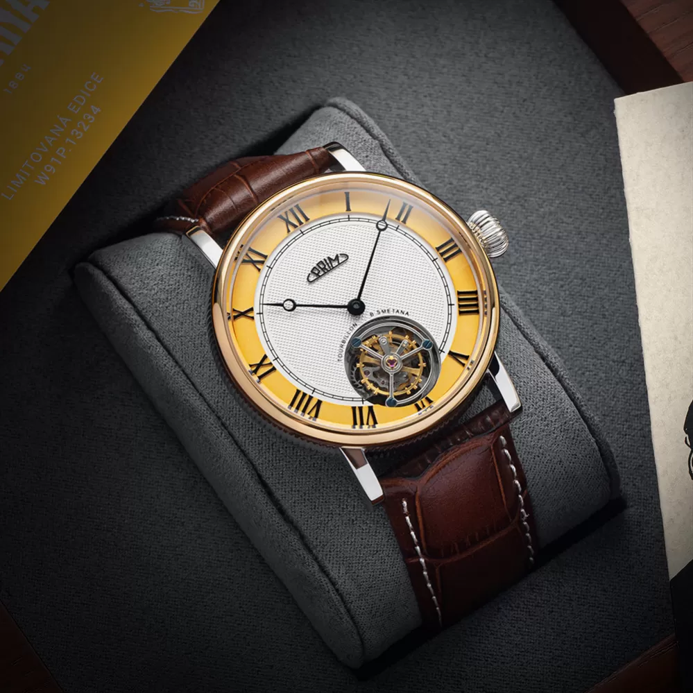 Společnost PRIM představuje nový model hodinek PRIM Tourbillon Bedřich Smetana, jedinečnou limitovanou edici na počest skladatele Bedřicha Smetany. Tento exkluzivní model vznikl k výročí jeho narození a oslavuje jeho význam pro českou hudbu a kulturu. Hodinky spojují nadčasovou eleganci, precizní hodinářskou práci a luxusní detaily. Edice je limitována na pouhých 50 kusů, z nichž 25 má okruží z 18karátového zlata o váze 12 gramů. Design doplňuje tulipánová korunka se 4mm drahým kamenem, jako je diamant, rubín nebo safír. Tento detail zdůrazňuje jedinečný charakter hodinek. Model se stává nejen výjimečným časoměřičem, ale i cenným sběratelským kouskem. Hodinky jsou dostupné s dodáním 3-7 pracovních dnů od zaplacení.