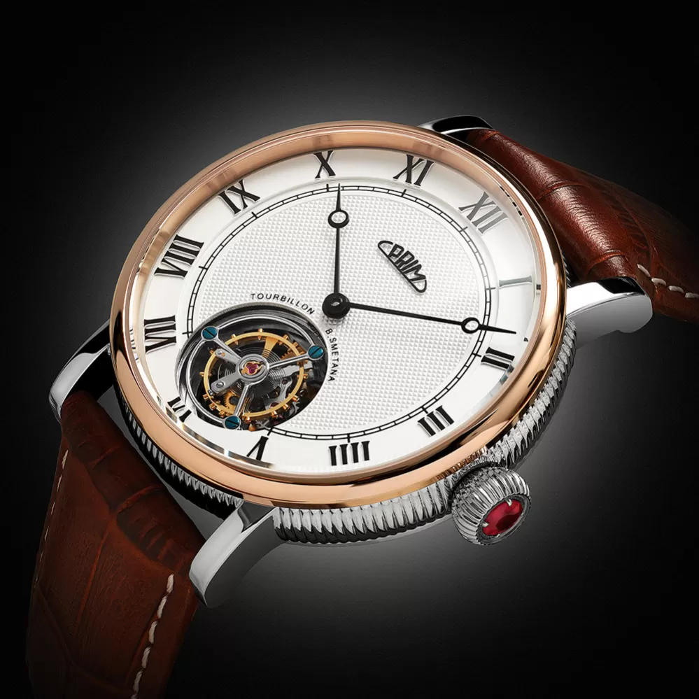 Společnost PRIM představuje nový model hodinek PRIM Tourbillon Bedřich Smetana, unikátní limitovanou edici na počest českého skladatele Bedřicha Smetany. Tento exkluzivní časoměřič vznikl k výročí Smetanova narození a oslavuje jeho přínos pro českou hudbu a kulturu. Hodinky spojují nadčasovou eleganci, precizní hodinářskou práci a luxusní detaily, čímž se stávají sběratelským klenotem. Limitovaná edice zahrnuje pouze 50 kusů, z nichž 25 zdobí okruží z 18karátového zlata o váze 12 gramů. Design korunuje tulipánová korunka s 4mm drahým kamenem, jako je diamant, rubín nebo safír. Tento detail dodává hodinkám nezaměnitelný vzhled. Model představuje dokonalé spojení tradiční hodinářské práce a kulturního odkazu. Hodinky budou dodány 3-7 pracovních dnů od zaplacení.