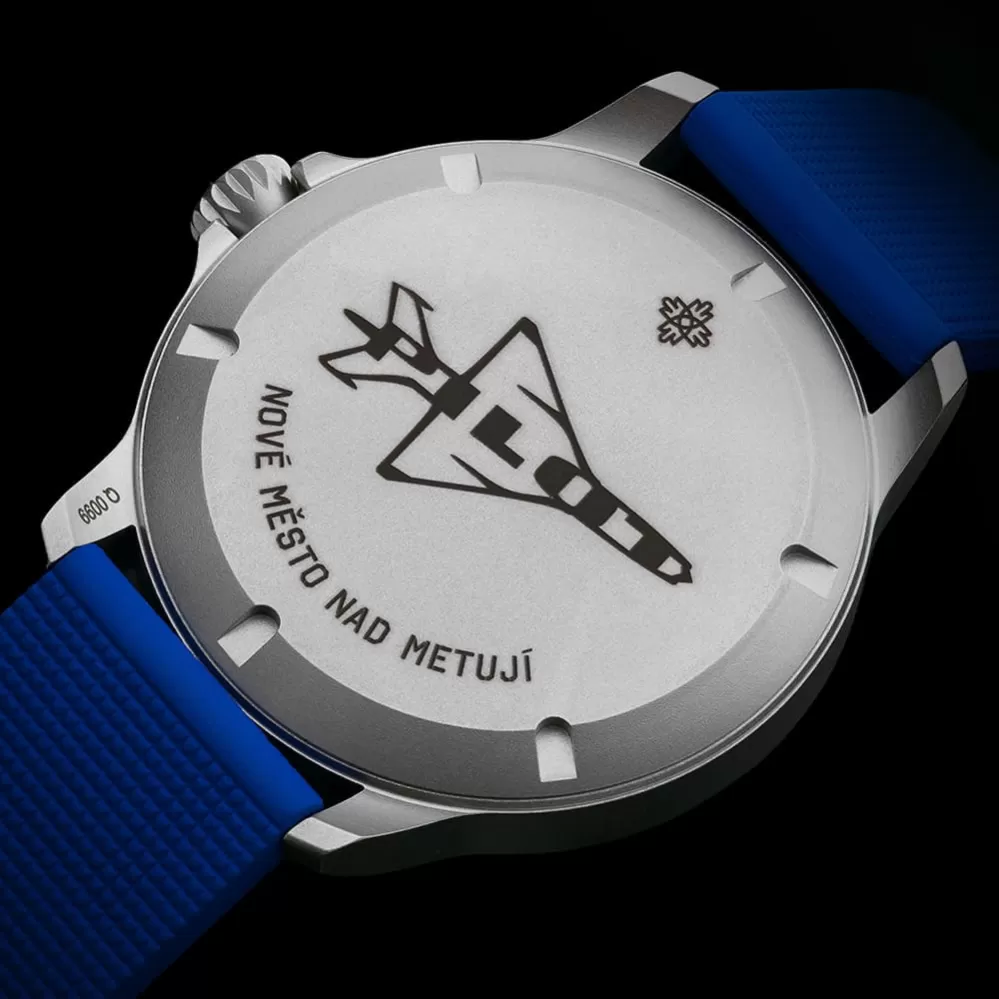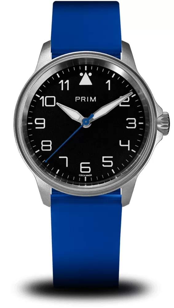 PRIM Pilot OK-Q spojují funkčnost s nadčasovým designem inspirovaným letectvím. Robustní nerezové pouzdro odkazuje na tradiční pilotní styl a zároveň zajišťuje pohodlí při každodenním nošení. Na číselníku vynikají výrazné číslice ve fontu PRIM a typický trojúhelník s tečkami na pozici 12. hodiny. Ručky s velkou luminiscenční plochou a sekundová ručka se šipkou garantují výbornou čitelnost i za zhoršených podmínek. O chod se stará quartzový strojek ETA F06.412, komfort doplňuje letecká korunka a kvalitní kaučukový řemínek.