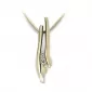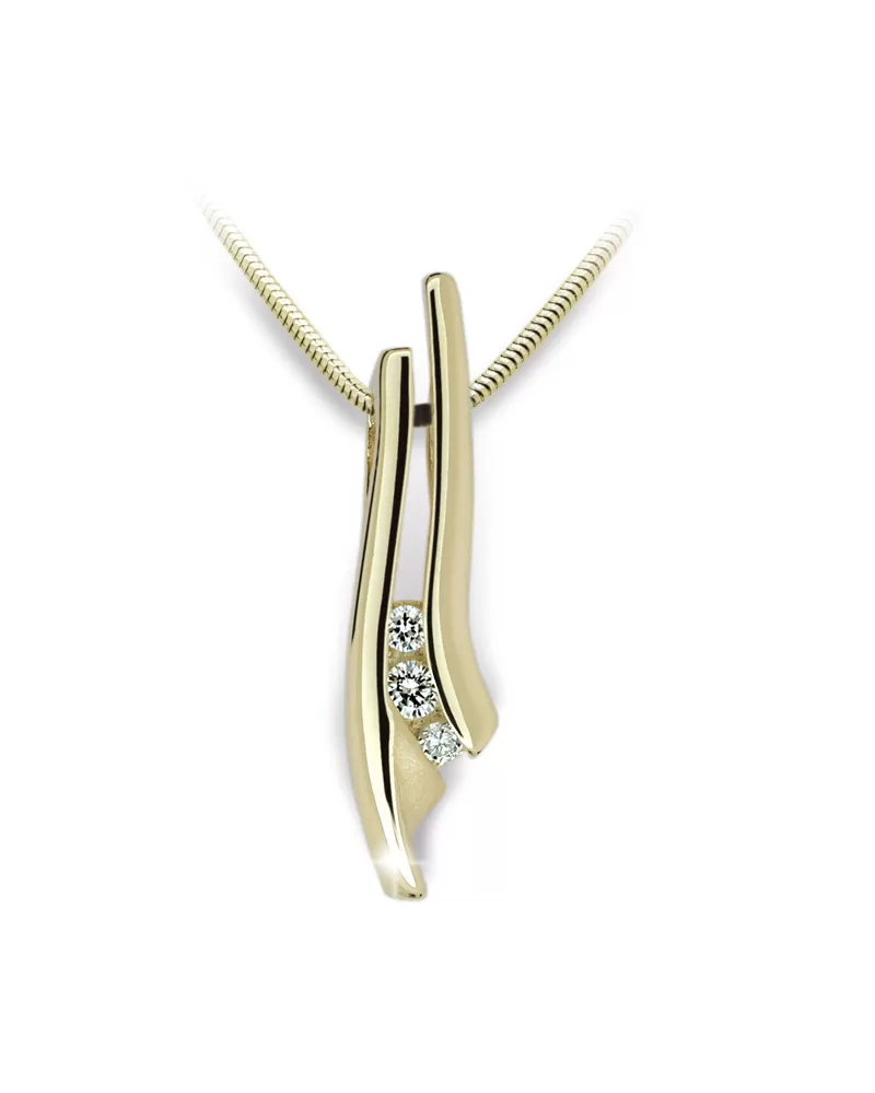 Přívěsek se třemi bílými zirkony ze žlutého čtrnácti karátového zlata 585/1000 v lesklé povrchové úpravě. Přívěsek je možno koupit s řetízkem, který je vyobrazen na doplňující fotografii.