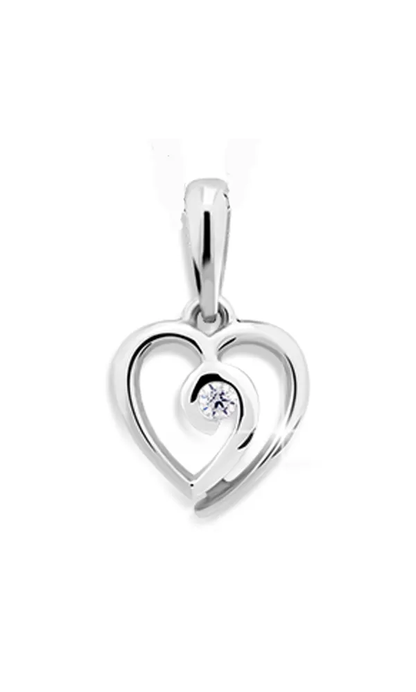 Srdce s jedním bílým zirkonem je vyrobeno z bílého čtrnácti karátového zlata 585/1000. Zlatý přívěsek je vyroben v lesklé povrchové úpravě.