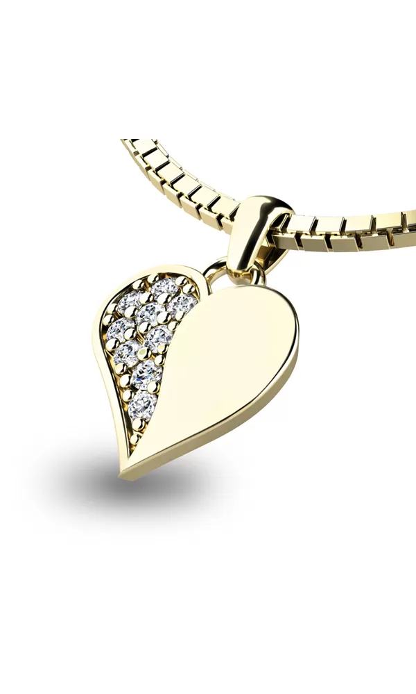 Chcete zapůsobit na vaší druhou polovičku? Rozzařte jí dekolt brilianty a nejlépe přívěskem ve tvaru srdce. Tento nádherný, zářivý přívěsek je vyroben ze žlutého čtrnáctikarátového zlata - 585/1000 v lesklé povrchové úpravě s devíti diamanty s briliantovým brusem, který dodává maximální lesk a brilanci diamantům a tak i celému šperku. Práce našich zlatníku je tak mimořádná, že můžete vidět dokonalé usazení každého briliantu.