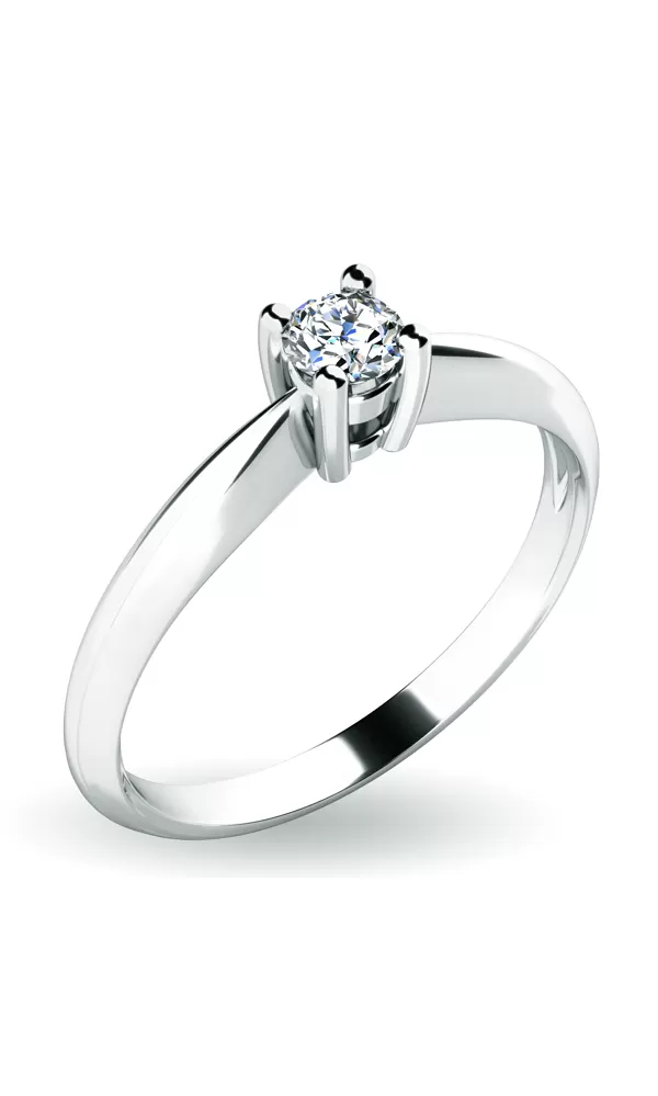 Elegantní diamantový soliter je vyroben z bílého čtrnáctikarátového zlata - 585/1000 v lesklé povrchové úpravě. Prsten má jeden kulatý diamant vsazený do čtyřkrapnové korunky.