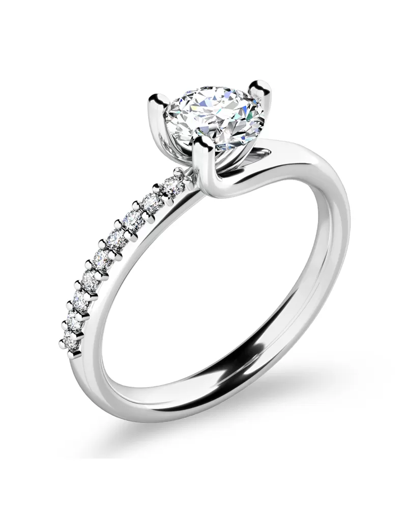 Elegantní prsten je vyroben z bílého čtrnáctikarátového zlata - 585/1000 v lesklé povrchové úpravě. Prsten má jeden hlavní dominantní diamant kulatého briliantového brusu, který je uchycený do tříkrapnové korunky. Toto uchycení nechá diamant dokonale vyniknout v jeho kráse a brusu. Na jedné straně - obroučce prstenu je vsazeno 9 zářivých diamantů, které prsten zjemňují. Všechny diamanty mají briliantový brus, který zajišťuje maximální brilanci vybroušených facet, dokonale odráží světlo a neuvěřitelné září z každého úhlu pohledu! Díky skladbě a stylově čistému vsazení diamantů, vyniká prsten krásnou brilancí kamenů. Vsazování diamantů do prstenů provádějí naši nejzkušenější mistři zlatníci ručně pod mikroskopem s přesností na 0,01mm a proto nehrozí vypadnutí kamínků jako to bývá u strojně vyráběných prstenů.