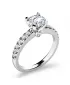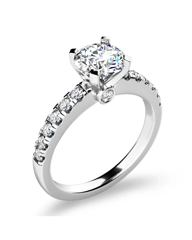 Tento prsten je vyroben z bílého čtrnáctikarátového zlata - 585/1000 v lesklé povrchové úpravě. Prsten má jeden hlavní dominantní diamant kulatého briliantového brusu, který je uchycený do čtyřkrapnové korunky. Toto uchycení nechá diamant dokonale vyniknout jeho kráse a brusu. Krásným detailem je vsazení diamantů i na boku korunky. Po stranách v obroučce prstenu je vsazeno na každé straně 6 zářivých diamantů, které prsten zjemňují. Zásnubní prsten ohromí z každé strany. Všechny diamanty mají briliantový brus, který zajišťuje maximální brilanci vybroušených facet, dokonale odráží světlo a neuvěřitelné září z každého úhlu pohledu! Díky skladbě a stylově čistému vsazení zirkonů, vyniká prsten krásnou brilancí kamenů. Vsazování diamantů do prstenů provádějí naši nejzkušenější mistři zlatníci ručně pod mikroskopem s přesností na 0,01mm a proto nehrozí vypadnutí kamínků jako to bývá u strojně vyráběných prstenů.