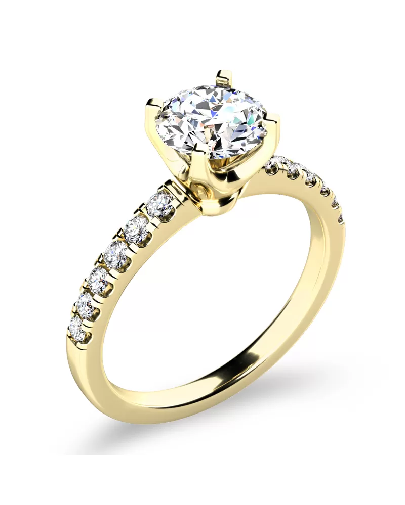 Zásnubní prsten je vyroben ze žlutého čtrnáctikarátového zlata - 585/1000 v lesklé povrchové úpravě. Prsten má jeden hlavní dominantní diamant kulatého briliantového brusu, který je uchycený do čtyřkrapnové korunky. Toto uchycení nechá diamant dokonale vyniknout jeho kráse a brusu. Po stranách v obroučce prstenu je vsazeno 12 zářivých diamantů, které prsten zjemňují. Všechny diamanty mají briliantový brus, který zajišťuje maximální brilanci vybroušených facet, dokonale odráží světlo a neuvěřitelné září z každého úhlu pohledu! Díky skladbě a stylově čistému vsazení diamantů, vyniká prsten krásnou brilancí kamenů. Vsazování diamantů do zásnubních prstenů provádějí naši nejzkušenější mistři zlatníci ručně pod mikroskopem s přesností na 0,01mm a proto nehrozí vypadnutí kamínků jako to bývá u strojně vyráběných zásnubních prstenů.