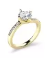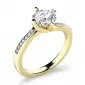 Zásnubní prsten je vyroben ze žlutého čtrnáctikarátového zlata - 585/1000 v lesklé povrchové úpravě. Prsten má jeden hlavní dominantní diamant kulatého briliantového brusu, který je uchycený do čtyřkrapnové korunky. Toto uchycení nechá diamant dokonale vyniknout v jeho kráse a brusu. Po stranách v obroučce prstenu je vsazeno na každé straně 7 zářivých diamantů, které prsten zjemňují. Všechny diamanty mají briliantový brus, který zajišťuje maximální brilanci vybroušených facet, dokonale odráží světlo a neuvěřitelné září z každého úhlu pohledu! Díky skladbě a stylově čistému vsazení diamantů, vyniká prsten krásnou brilancí kamenů. Vsazování diamantů do zásnubních prstenů provádějí naši nejzkušenější mistři zlatníci ručně pod mikroskopem s přesností na 0,01mm a proto nehrozí vypadnutí kamínků jako to bývá u strojně vyráběných zásnubních prstenů.