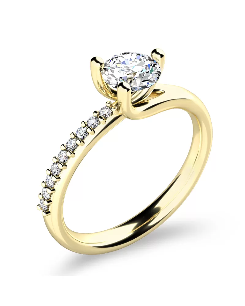 Zásnubní prsten je vyroben ze žlutého čtrnáctikarátového zlata - 585/1000 v lesklé povrchové úpravě. Prsten má jeden hlavní dominantní diamant kulatého briliantového brusu, který je uchycený do tříkrapnové korunky. Toto uchycení nechá diamant dokonale vyniknout v jeho kráse a brusu. Na jedné straně - obroučce prstenu je vsazeno 9 zářivých diamantů, které prsten zjemňují. Všechny diamanty mají briliantový brus, který zajišťuje maximální brilanci vybroušených facet, dokonale odráží světlo a neuvěřitelné září z každého úhlu pohledu! Díky skladbě a stylově čistému vsazení diamantů, vyniká prsten krásnou brilancí kamenů. Vsazování diamantů do zásnubních prstenů provádějí naši nejzkušenější mistři zlatníci ručně pod mikroskopem s přesností na 0,01mm a proto nehrozí vypadnutí kamínků jako to bývá u strojně vyráběných zásnubních prstenů.