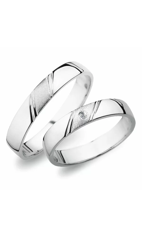 Snubní prsteny vyrobeny z bílého čtrnáctikarátového zlata 585/1000 půlkulatého profilu. Na každém prstenu jsou čtyři rýhy a mezi nimi je diamantový mat. V dámském prstenu je vsazen jeden kulatý zirkon s briliantovým brusem Signity star, který dodává zirkonu oslnivou brilanci. Do snubních prstenů si můžete nechat vsadit také diamant. Kámen je vsazen do prstenu "na hladko". Vsazování zirkonů i diamantů provádějí naši nejzkušenější mistři zlatníci ručně pod mikroskopem s přesností na 0,01mm a proto nehrozí vypadnutí kamínků jako to bývá u strojně vyráběných snubních prstenů. Snubní prsteny je možné vyrobit v různých barevných kombinacích zlata. Dále je možné snubní prsteny udělat užší - nižší cena nebo širší - vyšší cena.