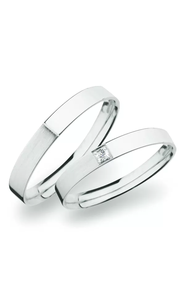 Snubní prsteny rovného profilu vyrobeny z bílého čtrnáctikarátového zlata 585/1000 v kombinované povrchové úpravě lesk - sametový mat. Snubní prsteny mají vnitřní Fit Profil - půlkulatou vnitřní stranu pro příjemnější nošení. V dámském prstenu je vsazen do čtverečku jeden kulatý  zirkon s briliantovým brusem Signity star, který dodává zirkonu oslnivou brilanci. Do snubních prstenů si můžete nechat vsadit také diamant. Kámen je vsazen do prstenu "do zrnek". Vsazování zirkonů i diamantů provádějí naši nejzkušenější mistři zlatníci ručně pod mikroskopem s přesností na 0,01mm a proto nehrozí vypadnutí kamínků jako to bývá u strojně vyráběných snubních prstenů. Snubní prsteny je možné vyrobit v libovolných úpravách např. s více kameny nebo vyrobit snubní prsteny užší - nižší cena nebo širší - vyšší cena.