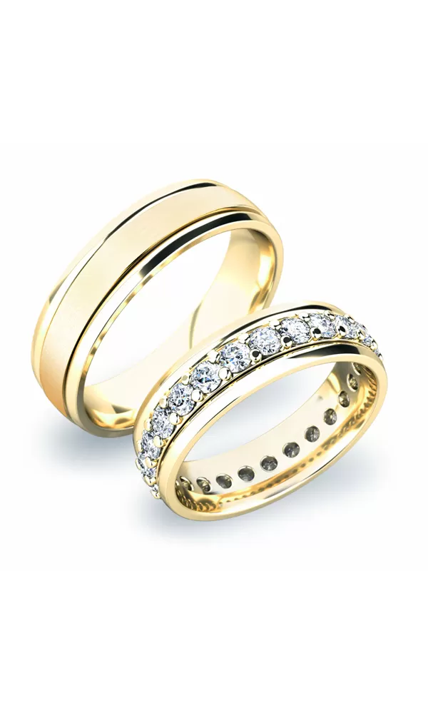 Luxusní snubní prsteny v mírně půlkulatém profilu jsou vyrobeny z bílého čtrnáctikarátového zlata 585/1000 v kombinované povrchové úpravě lesk -mat. Snubní prsteny mají vnitřní Fit Profil - půlkulatou vnitřní stranu pro příjemnější nošení, nasazování a sundavání. V dámském prstenu jsou vsazeny po celém obvodu zirkony s briliantovým brusem Signity star, který dodává zirkonům oslnivou brilanci. Do snubních prstenů si můžete nechat vsadit také diamanty. Kameny jsou do prstenu vsazeny "do krapniček". Vsazování zirkonů i diamantů provádějí naši nejzkušenější mistři zlatníci ručně pod mikroskopem s přesností na 0,01mm a proto nehrozí vypadnutí kamínků jako to bývá u strojně vyráběných snubních prstenů.
