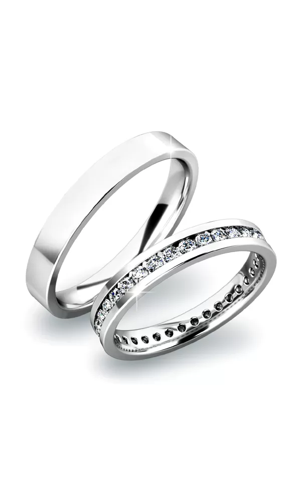 Moderní snubní prsteny rovného profilu jsou vyrobeny z bílého čtrnáctikarátového zlata 585/1000 v lesklé povrchové úpravě. Snubní prsteny mají vnitřní Fit Profil - půlkulatou vnitřní stranu pro příjemnější nošení, nasazování a sundavání. V dámském prstenu je vsazeno třicet čtyři zirkonů s briliantovým brusem Signity star, který dodává zirkonům oslnivou brilanci. Do snubních prstenů si můžete nechat vsadit také diamanty. Kameny jsou do prstenu vsazeny "na hladko - zatepáním". Vsazování zirkonů i diamantů provádějí naši nejzkušenější mistři zlatníci ručně pod mikroskopem s přesností na 0,01mm a proto nehrozí vypadnutí kamínků jako to bývá u strojně vyráběných snubních prstenů.