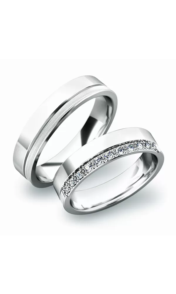 Masivní snubní prsteny v rovném profilu jsou vyrobeny z bílého čtrnáctikarátového zlata 585/1000 v kombinaci lesklé a matné povrchové úpravy. Snubní prsteny mají vnitřní Fit Profil - půlkulatou vnitřní stranu pro příjemnější nošení, nasazování a sundavání. V dámském prstenu je vsazeno jedenáct kulatých zirkonů s briliantovým brusem Signity star, který dodává zirkonům oslnivou brilanci. Do snubních prstenů si můžete nechat vsadit také diamanty. Kameny jsou vsazeny "do zrnek". Vsazování zirkonů i diamantů provádějí naši nejzkušenější mistři zlatníci ručně pod mikroskopem a proto nehrozí vypadnutí kamínků jako to bývá u strojně vyráběných snubních prstenů.