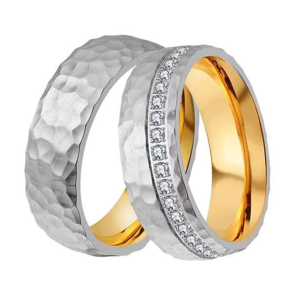 Snubní prsteny z chirurgické oceli v mírně půlkulatém profilu s matnou povrchovou úpravou. V dámském prstenu jsou po obvodu vsazeny zirkony s briliantovým brusem Signity star, který dodává zirkonům maximální brilanci. Vnitřek prstenu je zlacený technologií PVD v barvě žlutého zlata. Prsteny mají vnitřní fit profil - zaoblenou vnitřní stranu pro příjemnější nošení, nasazování a sundavání.