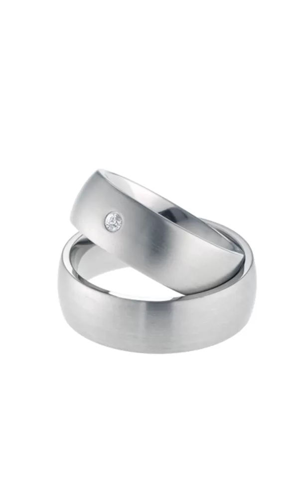 Snubní prsteny z titanu v mírně půlkulatém profilu s matnou povrchovou úpravou. V dámském prstenu je vsazen jeden kulatý zirkon s briliantovým brusem Signity star, který dodává zirkonům maximální brilanci. Prsteny mají vnitřní fit profil - zaoblenou vnitřní stranu pro příjemnější nošení, nasazování a sundavání.