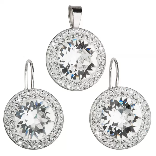 Sada šperků 39108.1 obsahuje kulaté visací náušnice a přívěšek ve stejné podobě. Šperky jsou zdobeny velkým kulatým Swarovski krystalem v bílé barvě, který je navíc lemován dvěma řadami menších bílých krystalků Swarovski. Šperky ze soupravy 39108.1 jsou vyrobeny ze stříbra ryzosti 925/1000 včetně povrchové úpravy rhodiem. Rhodium chrání šperk proti zčernání, zežloutnutí i poškrábání. Náušnice mají zapínání na klapku. Jelikož šperky neobsahuji žádný přídavek niklu, mohou je bez obav nosit i alergici.