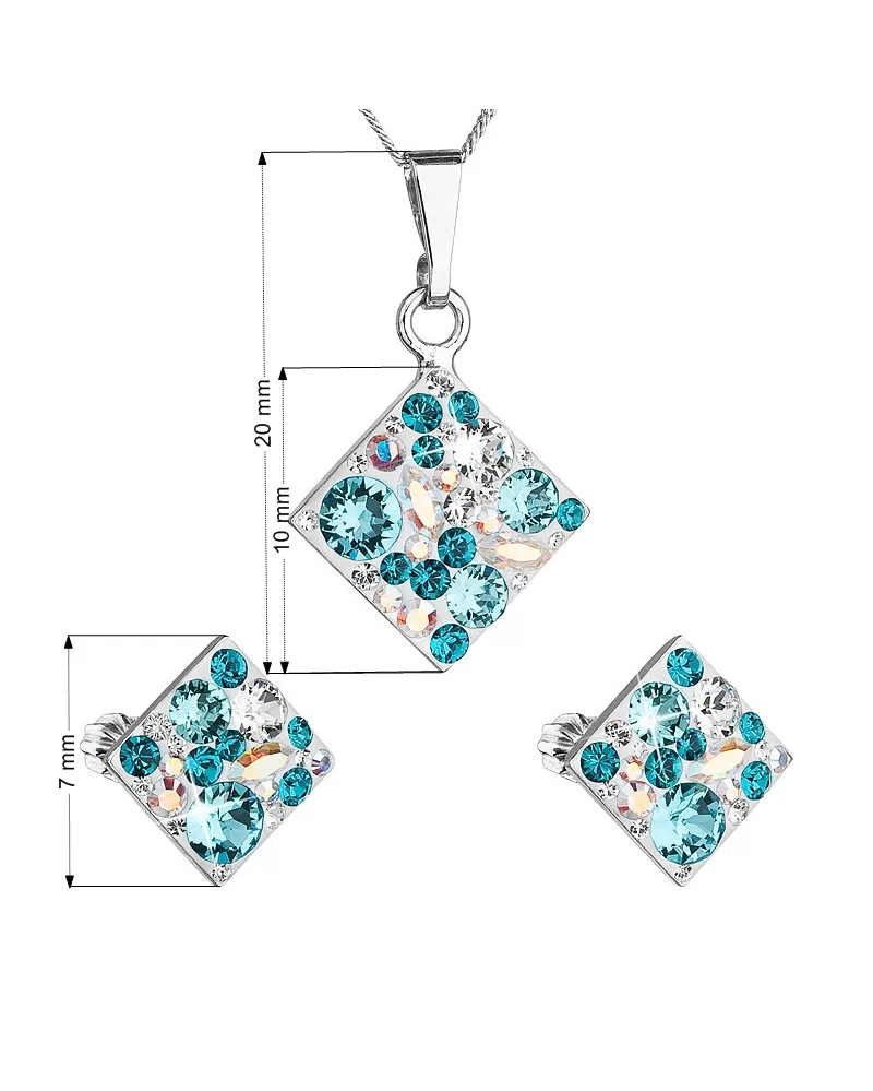 Sada šperků 39126.3 turquoise obsahuje náušnice pecky a řetízek s přívěskem. Šperky jsou ve tvaru kosočtverce a jsou vyrobeny ze stříbra ryzosti 925/1000, které prošlo povrchovou úpravou rhodiem. Rhodium chrání šperk proti zčernání, zežloutnutí i poškrábání. Přívěšek i náušnice jsou bohatě zdobeny třpytivými Swarovski krystaly v různých barvách. Náušnice mají zapínání na balónek. Jelikož šperky neobsahuji žádný přídavek niklu, mohou je bez obav nosit i alergici.