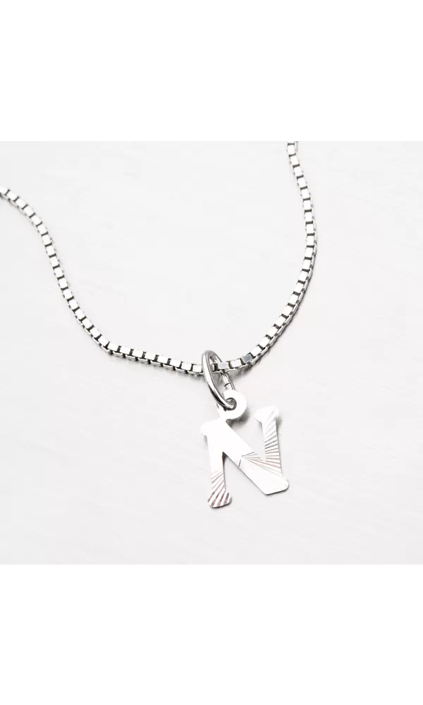 Přívěsek ve tvaru písmenka N je vyroben z rhodiovaného stříbra ryzosti 925/1000. Rhodium je ušlechtilý drahý kov ze skupiny platinových kovů. Rhodiováním stříbrných šperků galvanickým nanášením tohoto drahého platinového kovu se stává povrch šperku tvrdší, stálejší a odolnější vůči vnějším vlivům jako je mechanický otěr, poškrábání, nabíhání stříbra, lidský pot, kosmetické přípravky a další. Rhodium je antialergické. Přívěsek je vyroben v lesklé povrchové úpravě s facetami, které jsou dělané za pomocí diamantového nástroje a dodávají šperku maximální lesk a brilanci ze všech úhlů. K přívěsku je vhodné použít řetízek o průměru 2,50 mm.