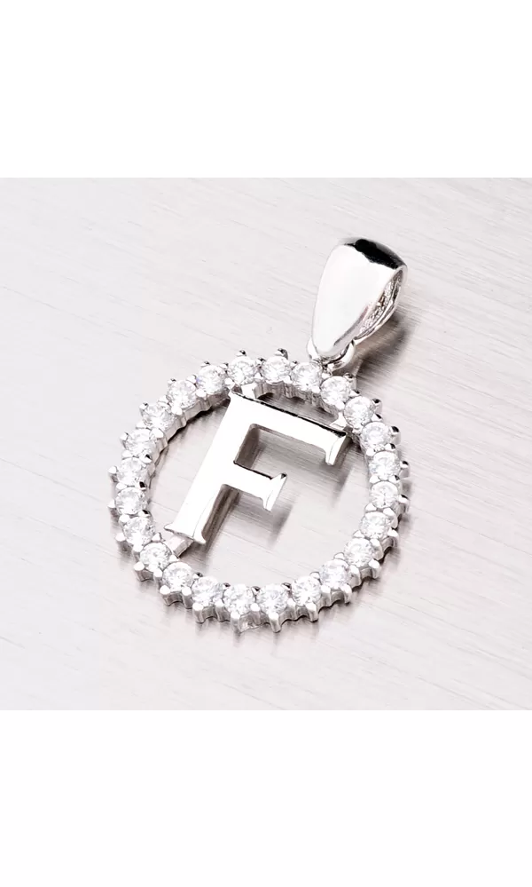 Zářivý přívěsek ve tvaru písmene F je vyroben z rhodiovaného stříbra ryzosti 925/1000. Přívěsek je vyroben v lesklé povrchové úpravě a je osazen třpytivými zirkony. K přívěsku je vhodné použít řetízek o průměru 2,75 mm.