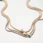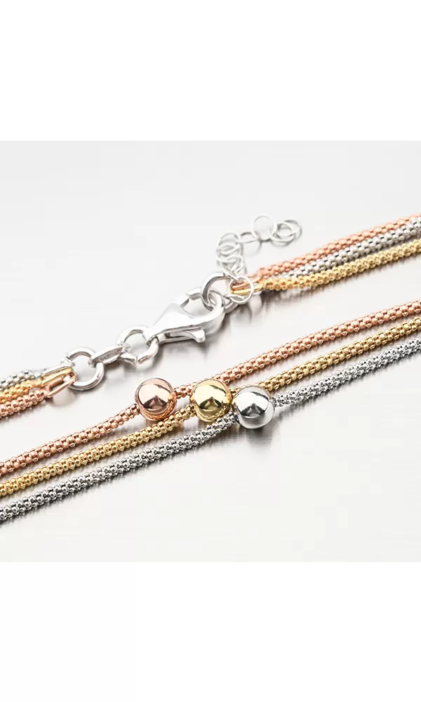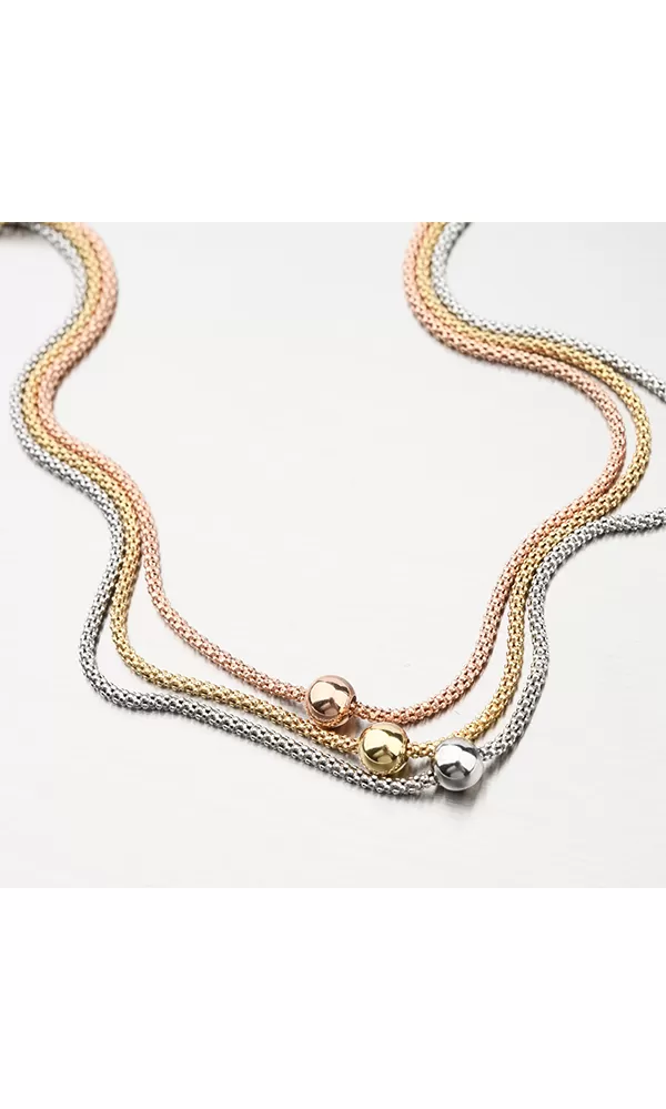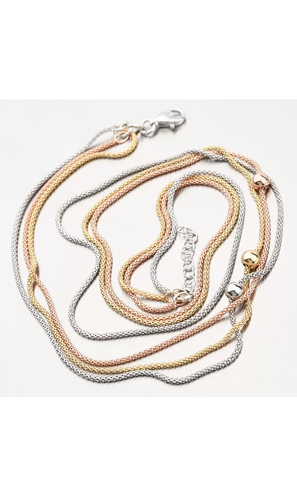 Tento rhodiovaný náhrdelník ze stříbra o ryzosti 925/1000 je tvořen třemi řetízky se střídajícími se barvami. Jeden je stříbrný, jeden růžový a jeden žlutý.Tento elegantní řetízek je kouskem módy, který určitě musíte mít - speciální je na něm totiž to, že každý řetízek má jinou délku, na krku vypadá úchvatně. Navíc je zdobený lesklými pohyblivými kuličkami, které perfektně zapadnou na střed řetízku.