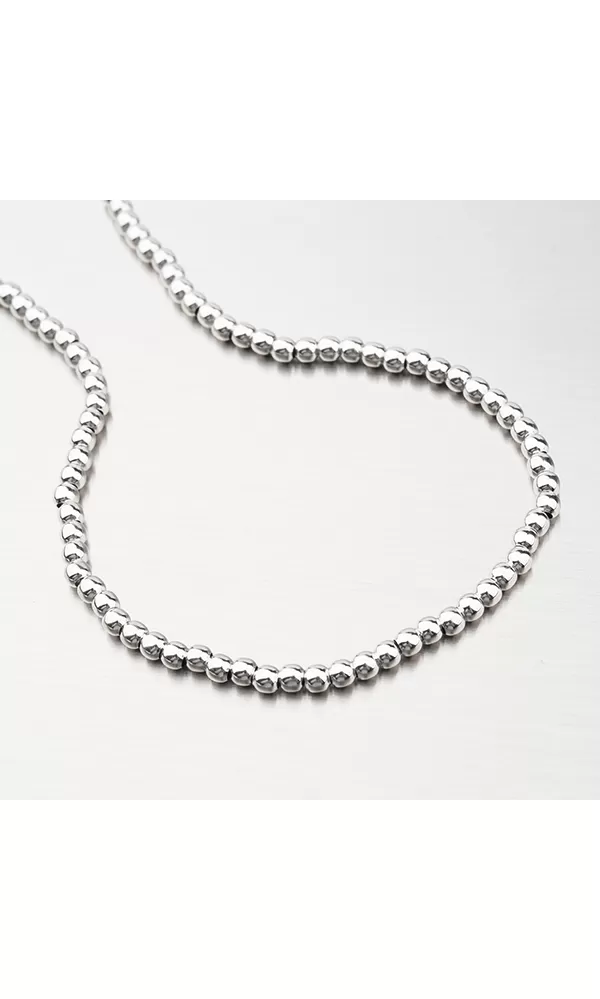 Elegantní stříbrný náhrdelník, kde jsou po celém obvodu lemované lesklé kuličky navlečené na řetízku.