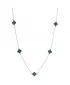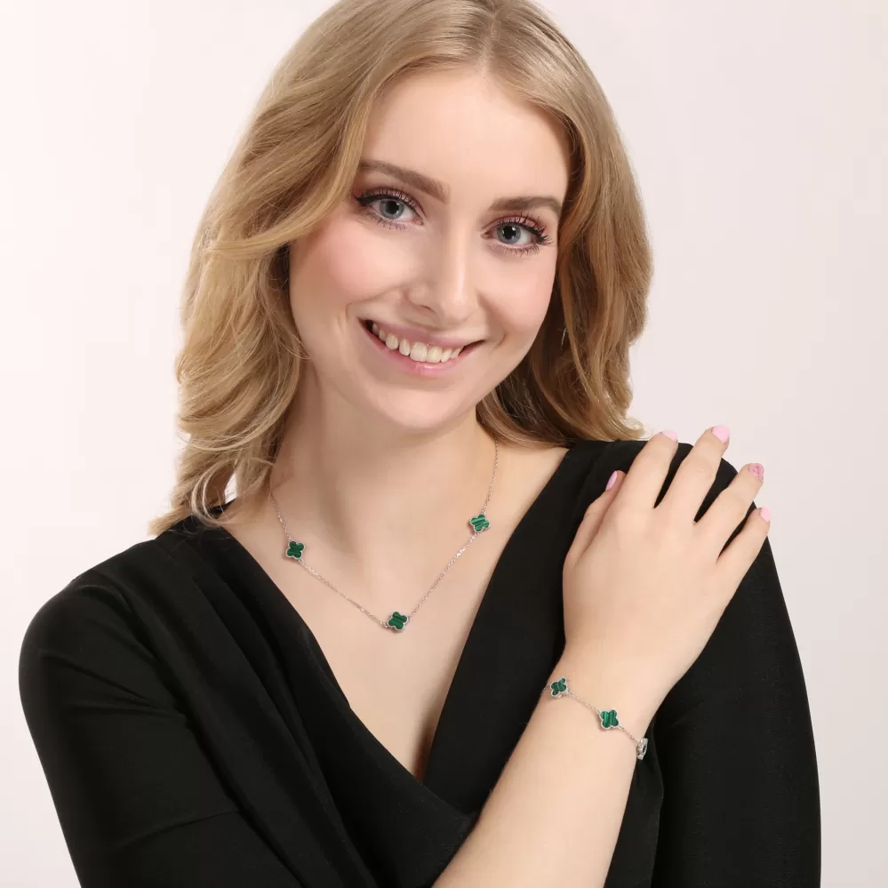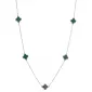 Jemný stříbrný náhrdelník s půvabnými čtyřlístky je symbolem štěstí a nadčasové elegance. Každý čtyřlístek je vyplněn zeleným malachitem, který dodává šperku jedinečný a přírodní charakter.